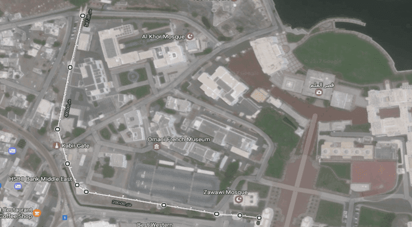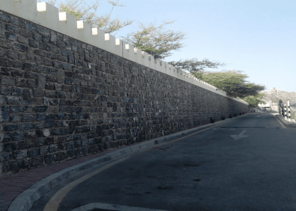 وتتخلل الأضلاع ثمانية أبراج مستديرة على مسافات يبلغ متوسطها حوالي 300م . وكان للسور خندق يمتد في مسار موازٍ له من الخارج، وقد حفر لبناء السور في أواخر القرن السابع عشر الميلادي ( القرنين الحادي عشر والثاني عشرالهجريين )، وظل متصلا بالبحر حتى أواخر الستينات من القرن العشرين الميلادي (الرابع عشر الهجري ) عبر قناة تصريف الوادي الكبير ووادي العور التي تمر تحت باب المثاعيب باتجاه الساحل، وتصب في خور عند الفرضة الواقعة تحت قلعة الميراني. وقد رُمِّمَ السور عام 1979م ، وكُسِيَ بمواد البناء الحديثة، ولم يعد من الممكن رؤية طابعه التراثي القديم.